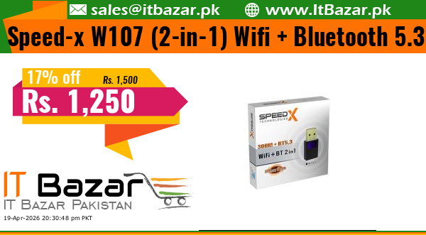 The SPEED-X W107 is a compact 2-in-1 USB adapter that combines high-speed WiFi (300Mbps) and Bluetooth 5.3 connectivity in one sleek device. Perfect for desktops, laptops, and PCs, it offers a stable wireless internet connection along with advanced Bluetooth support for seamless pairing with headphones, speakers, keyboards, mice, and more. With its driver-free installation, this plug-and-play adapter makes setup quick and hassle-free.